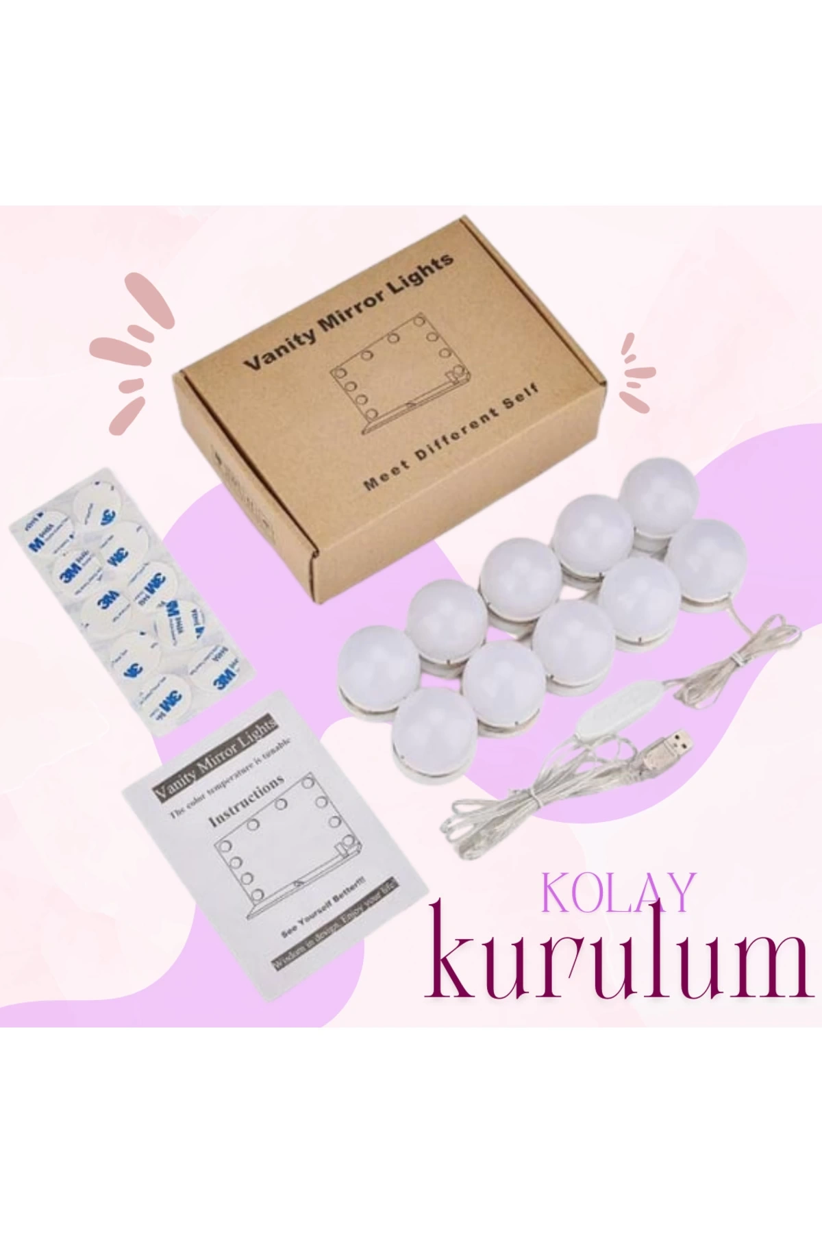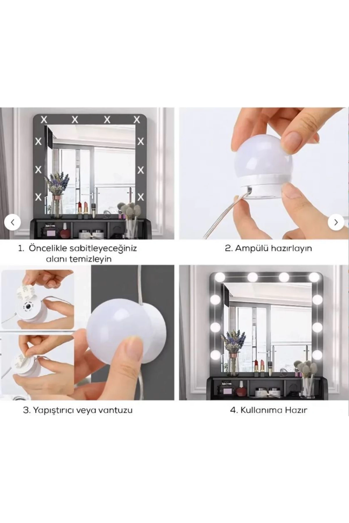 Nostaljik Hollywood Tarzı 10’lu Makyaj Aynası Masası – Beyaz LED Işıklı USB Lamba