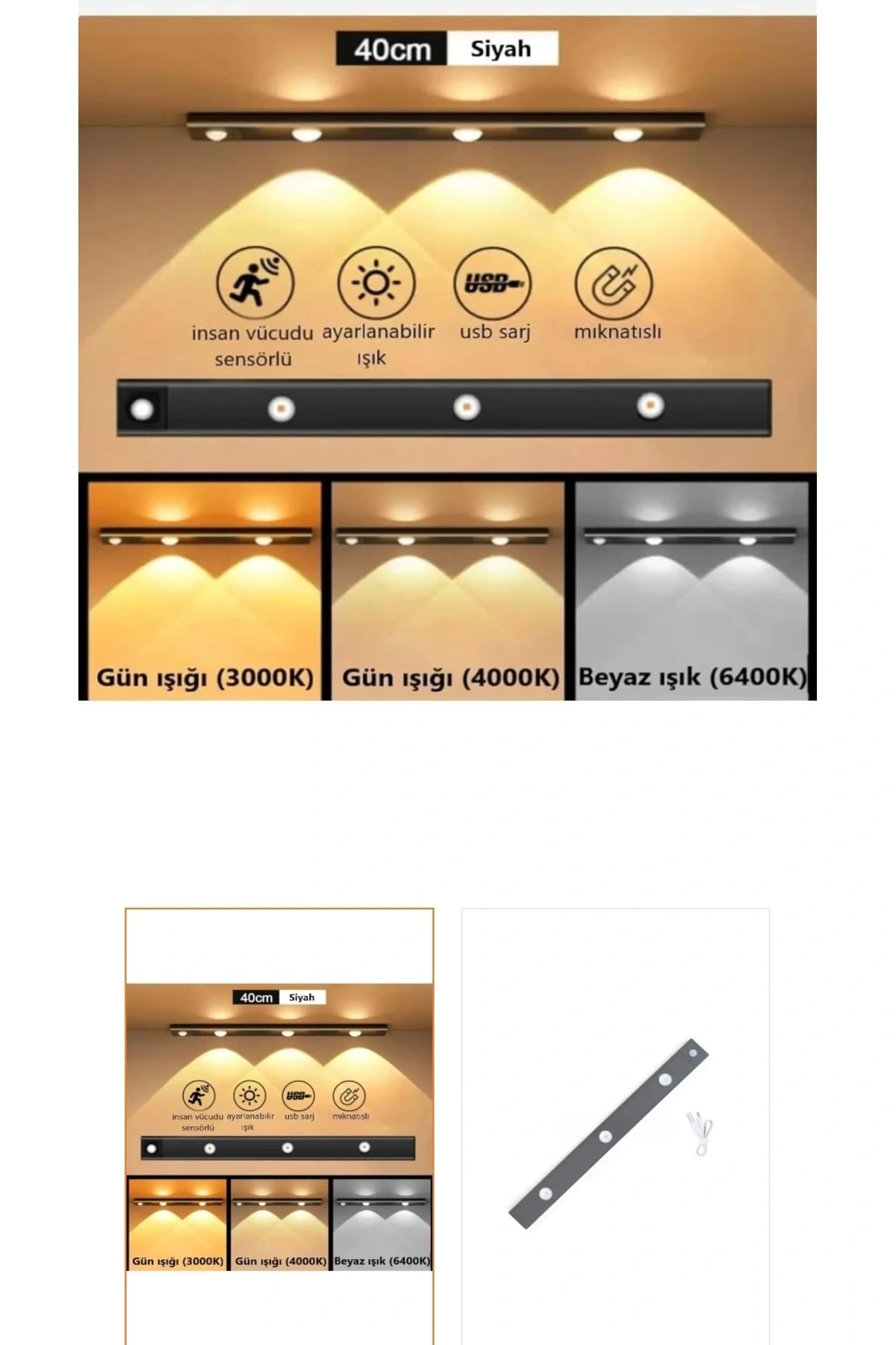 Hareket Sensörlü - Dekoratif Gece Lambası - Usb Şarjlı Led Aydınlatma Siyah Kasa 40cm Şarjlı Dolap L