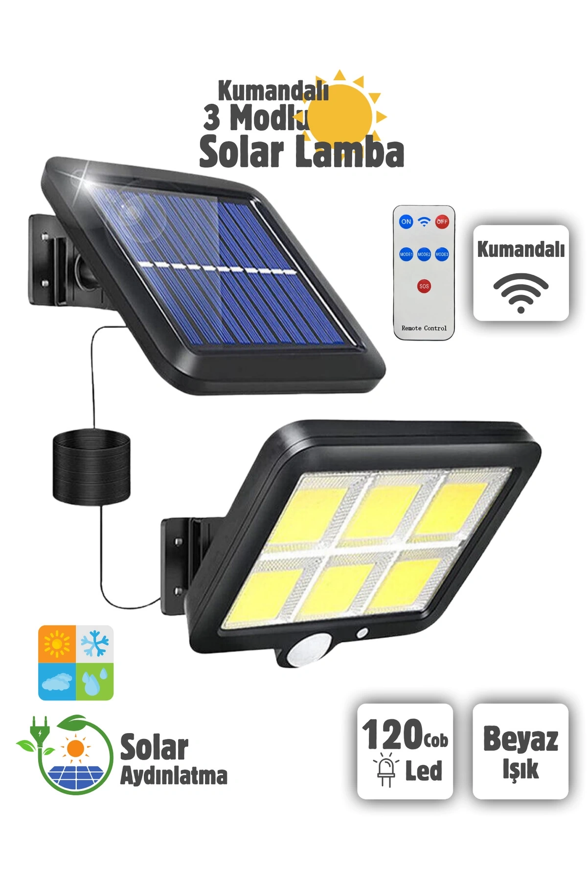 120 Cob Led 4,70 Mt Kablolu Solar Panel Güneş Enerjili Kumandalı 3 Mod Duvar Lambası