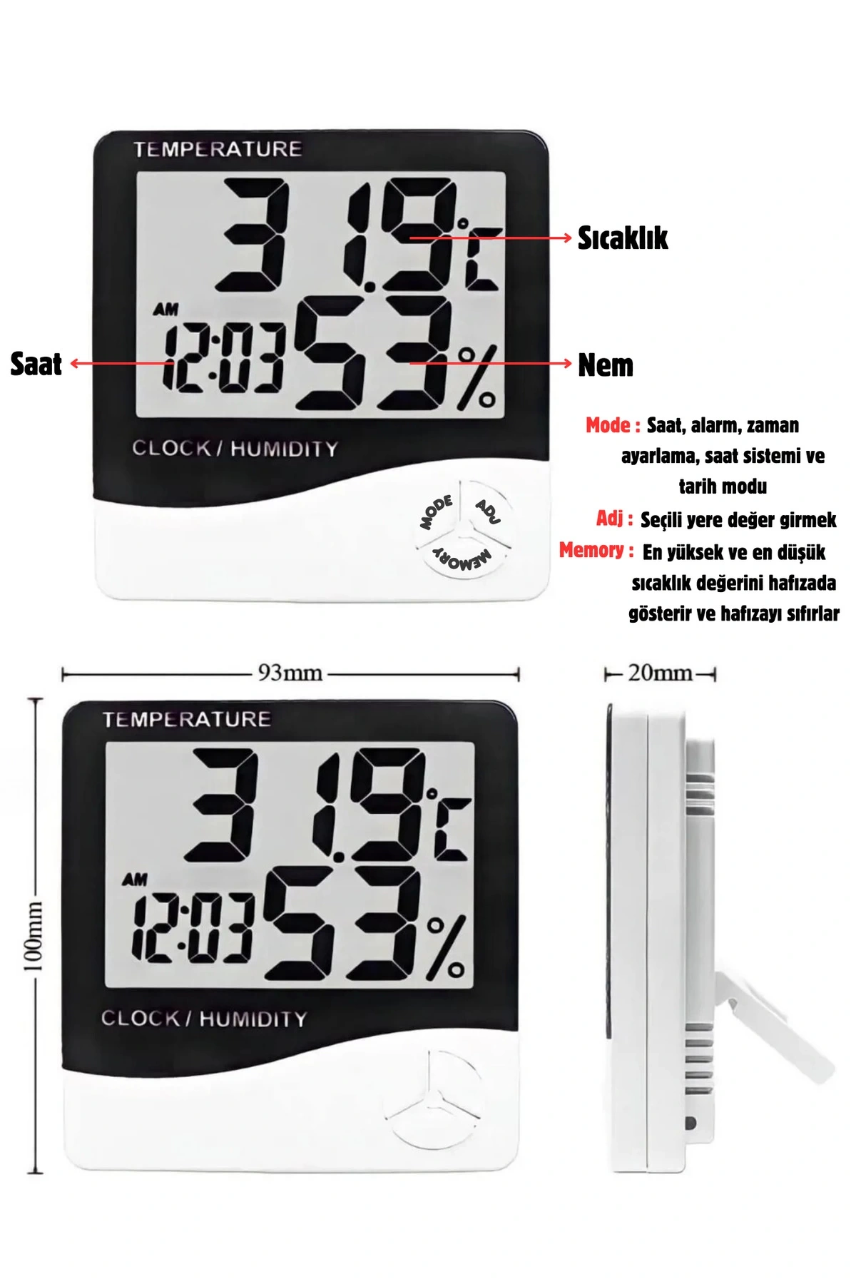Ev veya ofis ortamında sıcaklık ve nem seviyelerini kolayca takip edebilmeniz için tasarlanmış dijital oda termometresi ve nem ölçer; Modern ve şık tasarımıyla her türlü dekorasyona uyum sağlayan masa saati görünümünde; Hassas ölçümler için yüksek kaliteli sensörler kullanarak, sıcaklık ve nem değerlerini doğru bir şekilde kaydeder; Uyku modu özelliği sayesinde enerji tasarrufu sağlar ve pil ömrünü uzatır; Alarm fonksiyonu ile belirli sıcaklık veya nem seviyelerine ulaşıldığında uyarı verir, böylece konforunuzu artırır; Kolay okunabilir ekranı sayesinde sıcaklık ve nem değerlerini hızlıca kontrol edebilirsiniz;