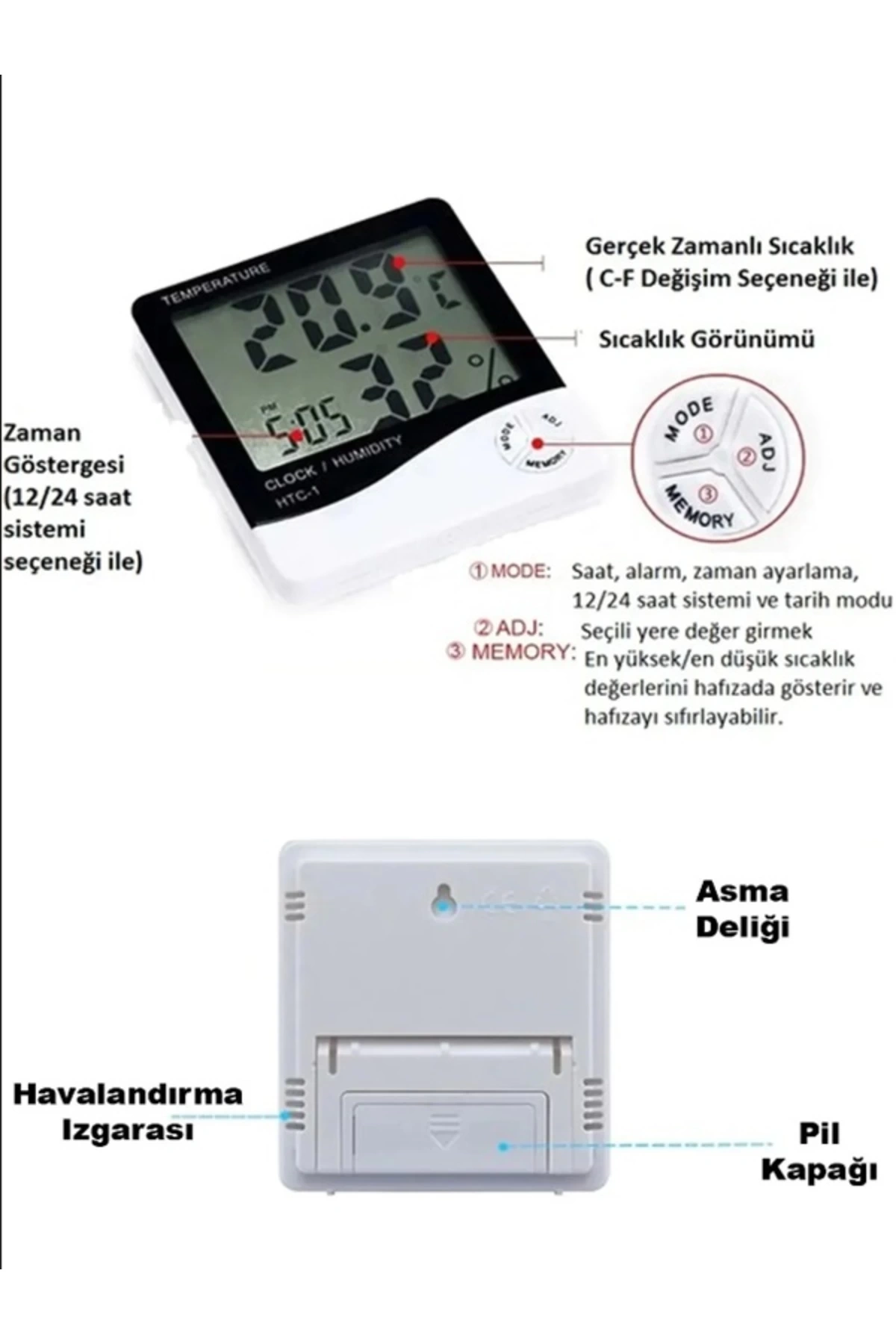 Kolay okunabilirlik için LCD ekran özelliği ile sıcaklık ve nem değerlerini net bir şekilde görüntüler; Ortam termometre ve nem ölçer olarak tasarlanmış, evinizin veya ofisinizin konforunu kontrol altında tutmanıza yardımcı olur; Dijital termometre hava nem ölçer, HTC; 1 Tempature, evinizin veya ofisinizin sıcaklık ve nem seviyelerini ölçerek ideal bir ortam sağlar;