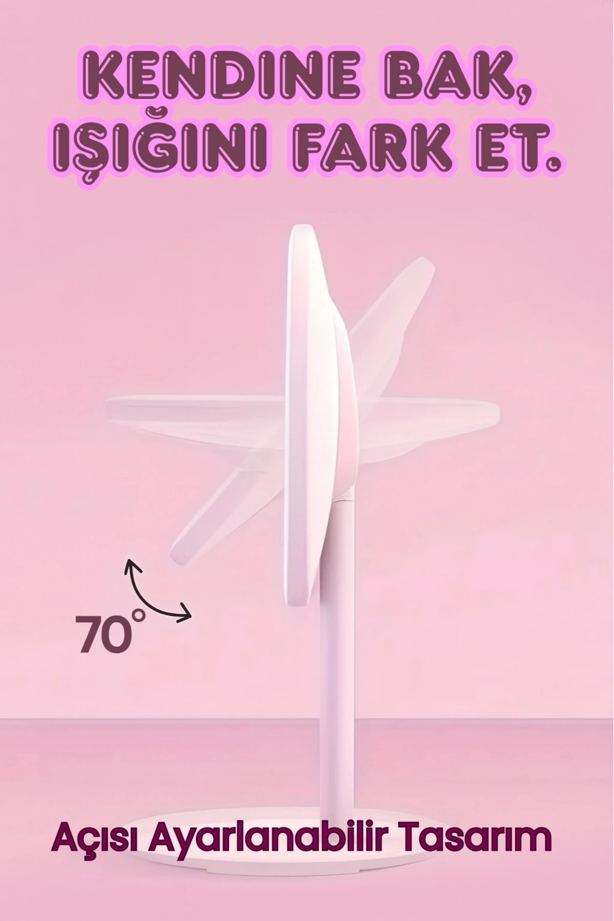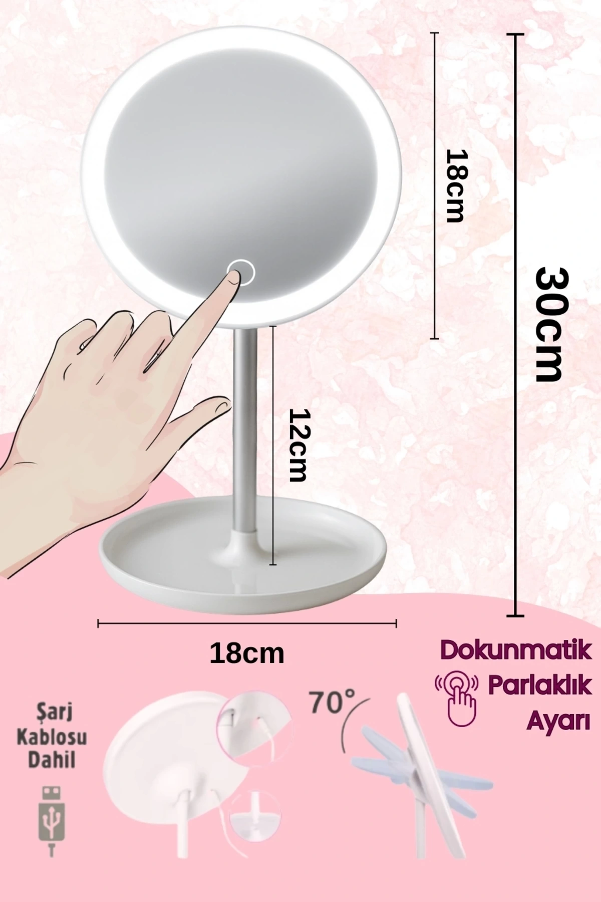 Makyaj Aynası LED Aydınlatma, Şarj Edilebilir, Masaüstü, Dokunmatik Ekran Anahtarlı, 180 Derece Dönebilir Ultra geniş görüş alanı: Birden fazla görüş açısı sunar, böylece her zaman kendinizi iyi hissedersiniz!; Ayarlanabilir parlaklık: LED kozmetik aynalar parlak gün ışığı sağlar, aynayı açmak / kapatmak için "dokunmatik düğmeye" uzun basarak ışıkları kısabilir veya aydınlatabilirsiniz.; Yüksek Kalite ve 180 ° Döndürme: 180 ° serbestçe döndürülebilir, böylece aynayı ihtiyaçlarınıza göre ayarlayabilir ve özelleştirebilirsiniz.; GELİŞTİRİLMİŞ TASARIM: Saklama kutusu tasarımı, mücevherler, saatler, küpeler, bilezikler gibi kozmetik ürünlerini içine alabilir ve masaüstünüzü dağınıklığından sizi kurtarır.; Paket içeriği: 1x ayna 1x USB kablosu Özellikler: Güç: 4W Giriş voltajı: 5 V / 1 A Değişebilen LED ışıklar pil kapasitesi: 1000mAh; Ölçüleri: En: 17 cm Boy: 27,5 cm;