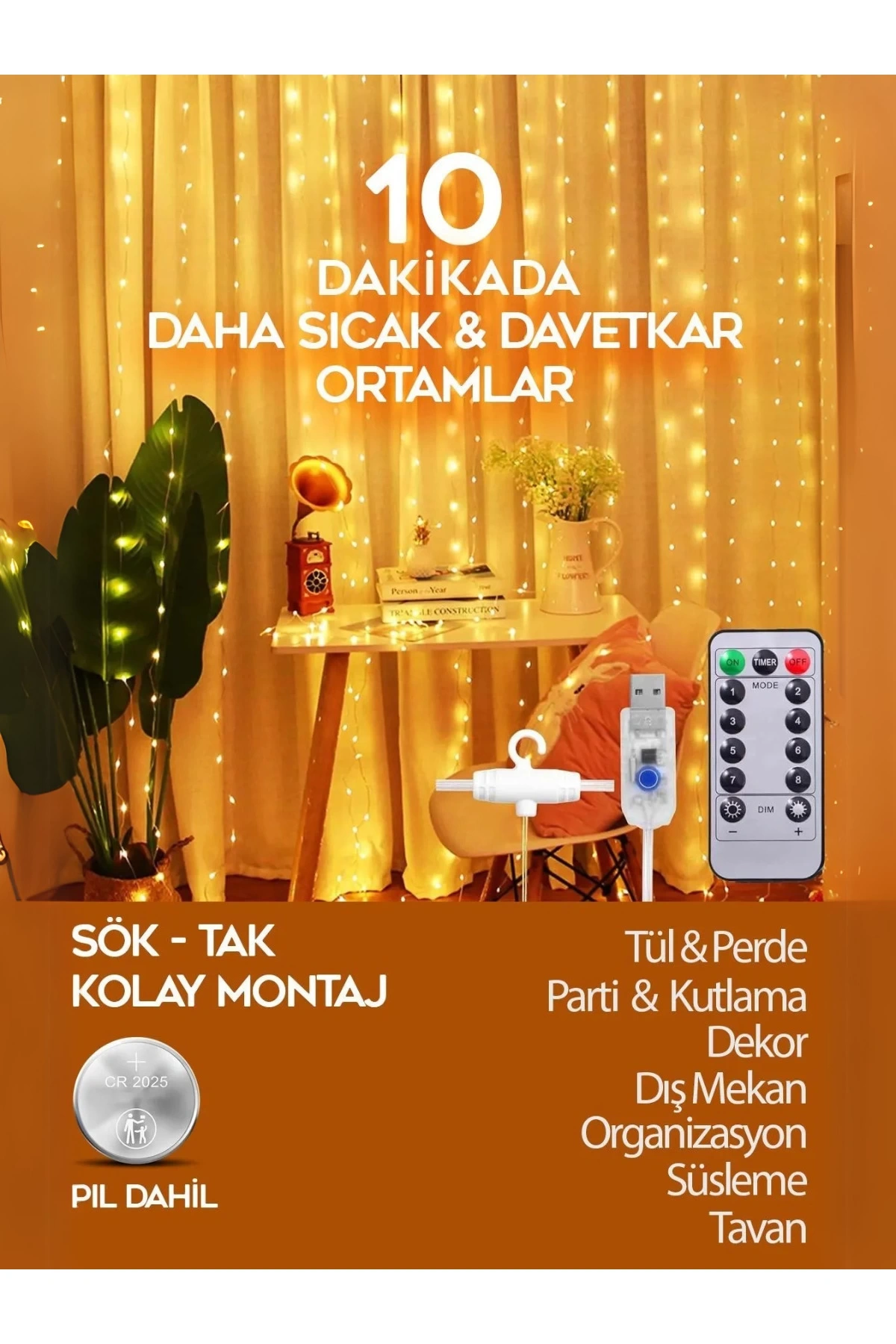 Kumandalı 8 Ayrı Moda Sahip 3mx3m ( 300 Cm X 300 Cm ) PerdeLed 10 Saçaklı Gün Işığı Üzerinde 8 mod,zamanlayıcı, parlaklık ayarlayıcı bulunan Kumandası mevcuttur.; ; Timer yazılıyerde zamanlayıcı ile 8 saat çalışıp 16 saat kapalı kalmasınısağlayabilirsiniz.; ; Kumandanın en altında ise +,- ibareli yerlerden parlaklığıazaltıp artırabilirsiniz.; ; Usb ile çalışmaktadır.; ; Usb üzerinde bulunan düğme ilede animasyonlar arası geçiş sağlanabilir.; ; USB Port Girişi SayesindePowerbank-Telefon Sarj Adaptörleri-Tv Usb Giriş-Tv Ve Pc Usb Girişlerisayesinde Ürünü Kullanabilirsiniz;