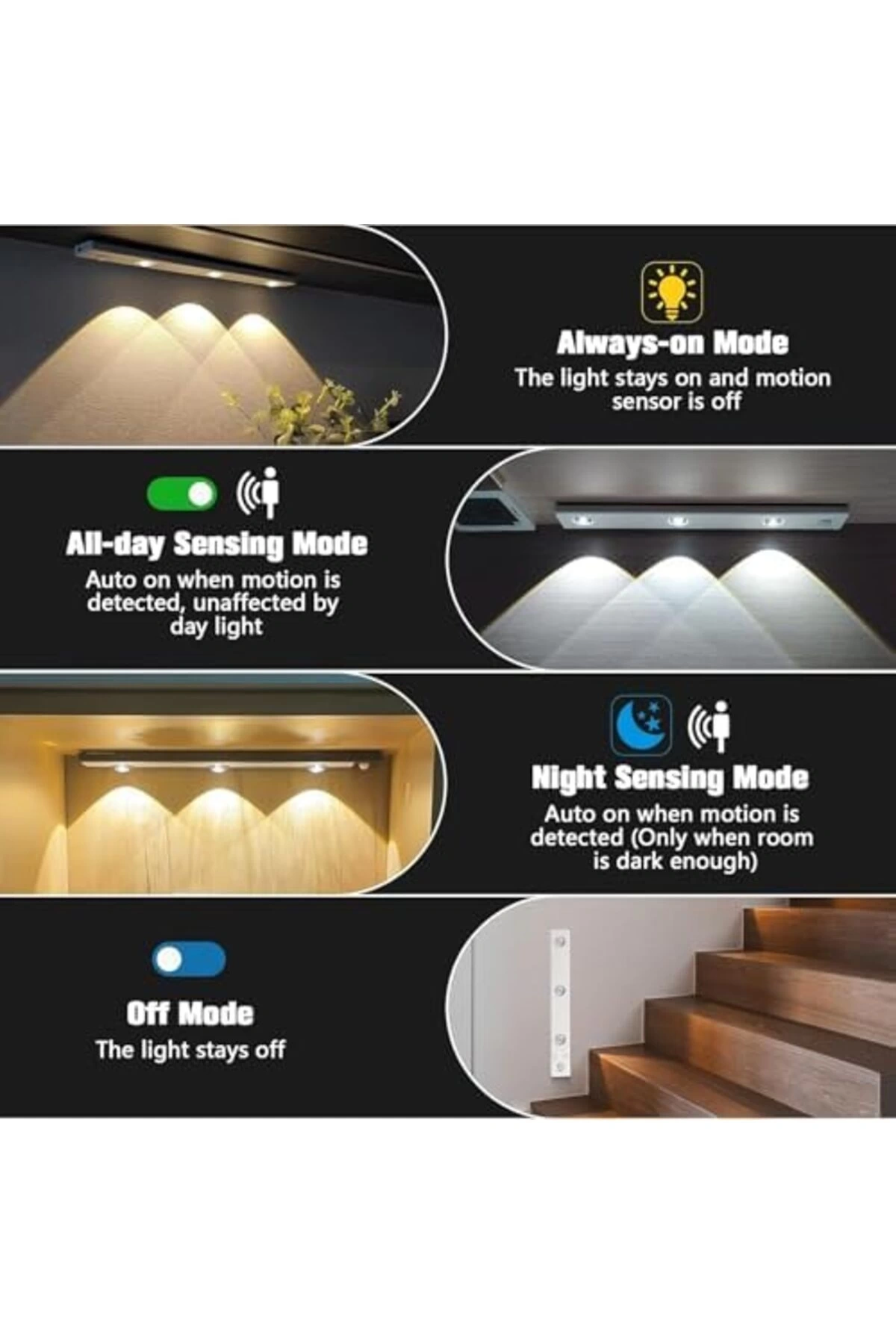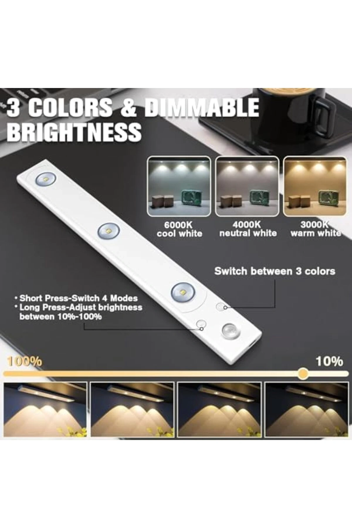 Benzersiz kedi gözü efekti: Forlife LED alt ünite ışığımız, duvarda benzersiz bir kedi gözü aydınlatma efekti yaratan yüksek performanslı bir lense sahiptir.; Mutfağınızda, koridorunuzda, giriş yolunuzda, gardırobunuzda, vitrininizde, kitapçınızda, tuvalet masanızda veya sanat serginizde olsun, bu dolap aydınlatması belirgin bir aydınlatma efekti yaratır ve rahat bir atmosfer yaratır.; 3 modlu akıllı hareket sensörü: LED alt ünite mutfak ışığımız, 120° geniş algılama açısı ve 3 metre algılama aralığına sahip akıllı bir hareket sensörüyle donatılmıştır.; İhtiyaçlarınızı karşılamak için 3 moddan birini seçebilirsiniz: sabit ışık modu, tüm gün hareket sensörü modu, yalnızca karanlıkta hareket sensörü modu ve kapalı modu, size akıllı ve kullanışlı bir aydınlatma deneyimi sunar.; Kısılabilir parlaklık ve 3 renk: Farklı aydınlatma ihtiyaçlarınızı karşılamak için alt ünite ışığının parlaklığını ve ışık rengini kolayca ayarlayın.; Üç ışık rengi arasında geçiş yapmak için düğmeye kısa basın: 6500K soğuk beyaz, 4000K nötr beyaz ve 3000K sıcak beyaz.; Sürekli olarak kısmak ve parlaklığı %10 ile %100 arasında ayarlamak için düğmeye uzun basın.; 400 mAh enerji: Hareket sensörlü dolap ışığı, dahili 400 mAh şarj ile donatılmıştır ve USB ile çalışır, tam şarjdan sonra 5 saate kadar uzun süreli aydınlatma sağlar.; Ayrıca, pilin şarj durumunu göstermek için şarj göstergelerine sahiptir.; Kablosuz manyetik kurulum: LED dolap ışıkları, delmeye gerek kalmadan kolay ve çıkarılabilir kablosuz kurulum için kendinden yapışkanlı pedler ile birlikte gelir.; Dilediğiniz yere kolayca monte edebilirsiniz.; Şarj Süresi: Ürün ilk kullanımda en az 6 saat süre ile şarj edilmelidir, daha sonra montajını yapabilirsiniz.; Ardından uzunca bir süre şarja ihtiyaç duymaz.; Şarj bitince kızaklı yapıda olduğu için yapışkanları sökmeden yerinden çıkartabilirsiniz, yada priz yakın ise çıkartmadan da şarj olanağı sağlar.; Paket İçeriği: 1 Adet 40 cm uzunluğunda led dolap altı aydınlatma.; 3 Led'li Şarjlı Dolap Altı Aydınlatma, Hareket Sensörlü, 3 Modlu, Yapışkanlı, Delme Gerektirmez, Slim Beyaz Kasa, Dekoratif, Kısılabilir Gece Lambası, Gardırop, Dolap, Merdiven Lambası 40 CM