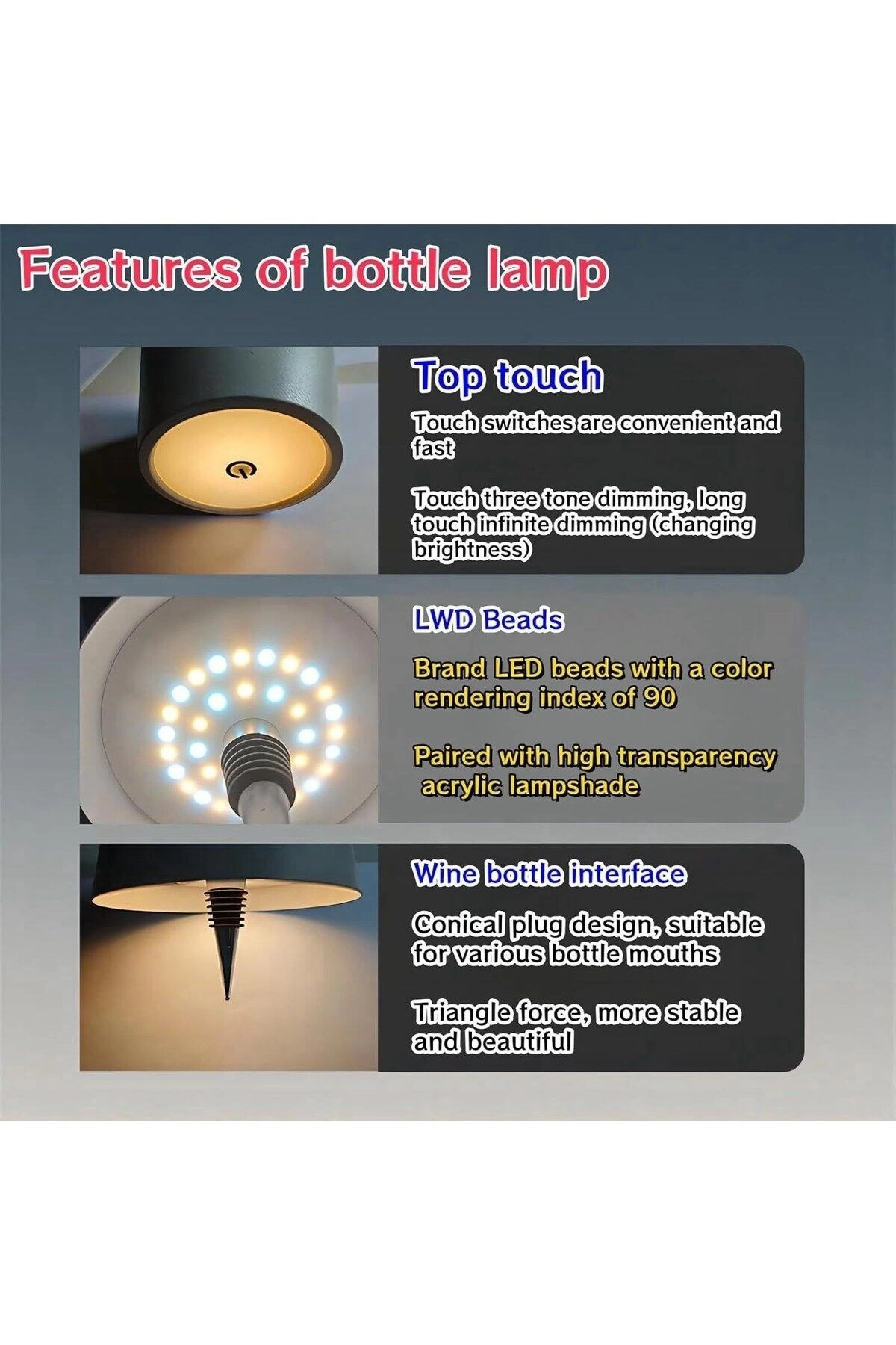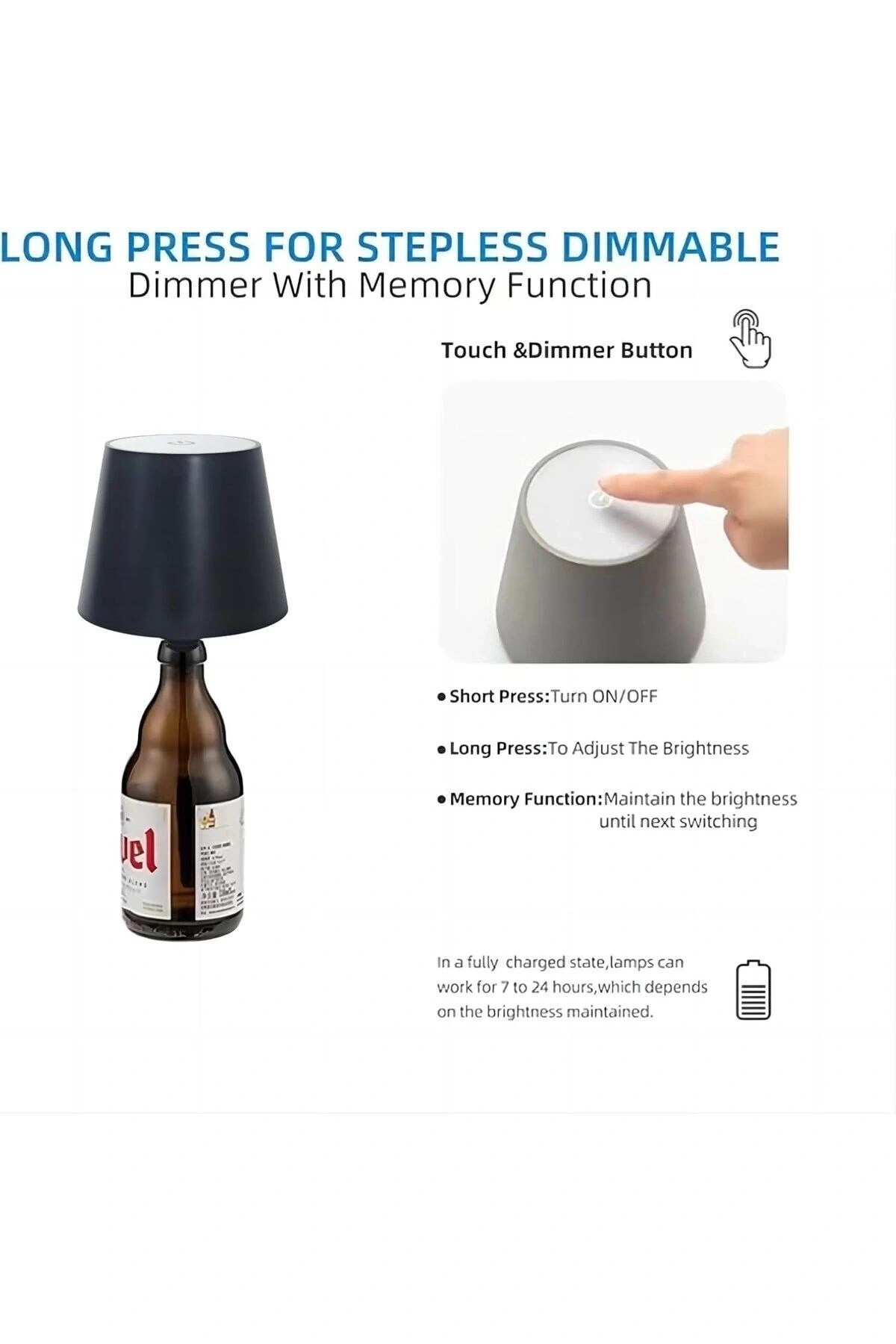 Siyah Renk Pilli Şişe Lambası – Kablosuz Dokunmatik LED Masa Lambası, USB Şarjlı, IP44 Su Geçirmez,