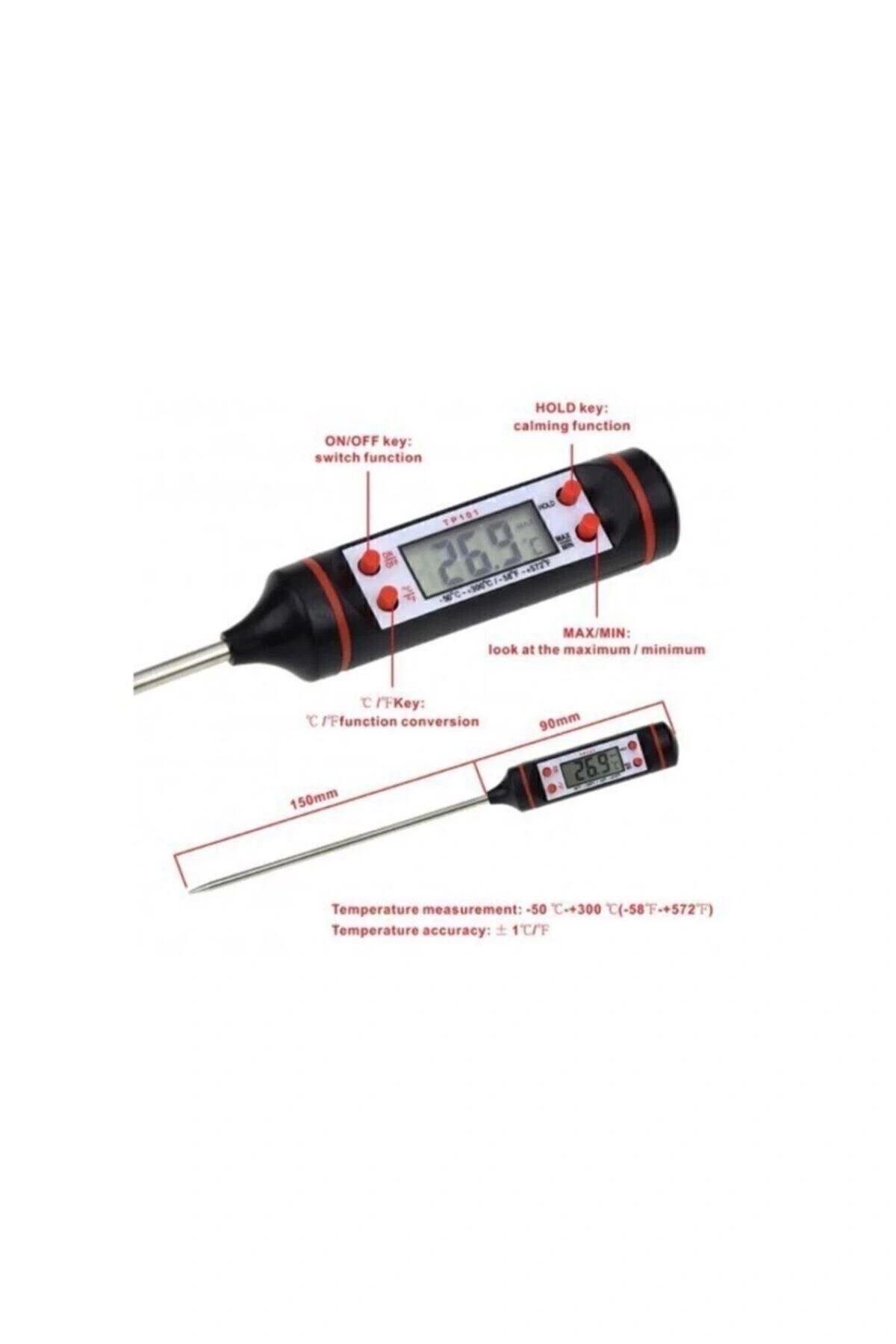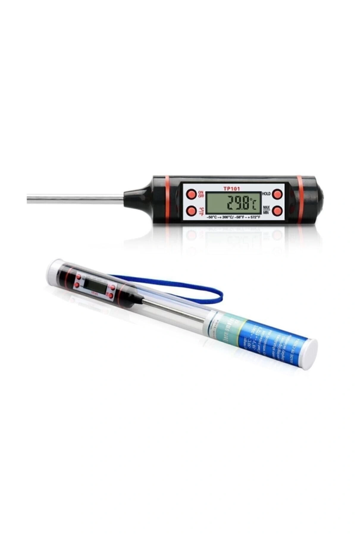 Daldırma Saplama Tipi Dijital Gıda Sıcaklık Ölçer Termometre Tp Daldırma Saplama Tipi Dijital Termometre Kutusu sayesinde termometreyi daha hijyenik, uzun ömürlü ve sağlıklı bir şekilde saklayabilirsiniz. Et, tavuk gibi katı gıda ve su, süt gibi sıvı gıdaların sıcaklık ölçümleri için idealdir. Paslanmaz çelik problu, dijital gıda termometresi 15cm uzun problu C-F ayarı 15 cm paslanmaz çelik prob uzunluğu Otomatik Kapama Ölçüm aralığı : -50......300° C Hassasiyet : ± 1°C Çözünürlük : 0.1 °C max/min değer gösterme.;