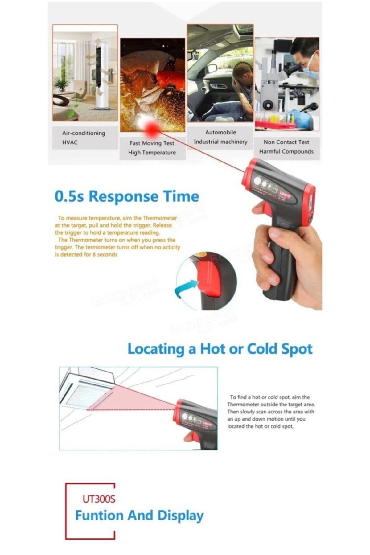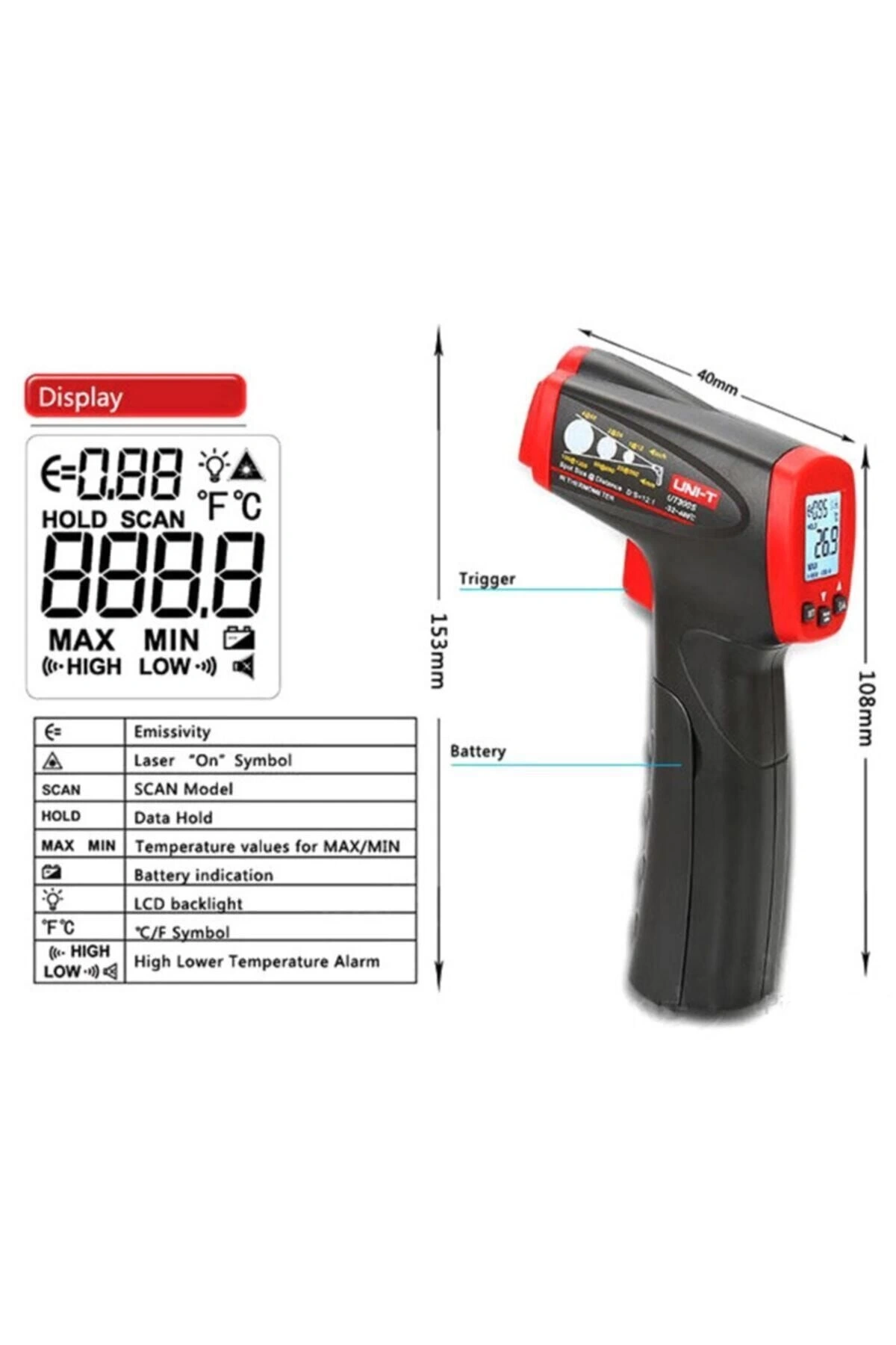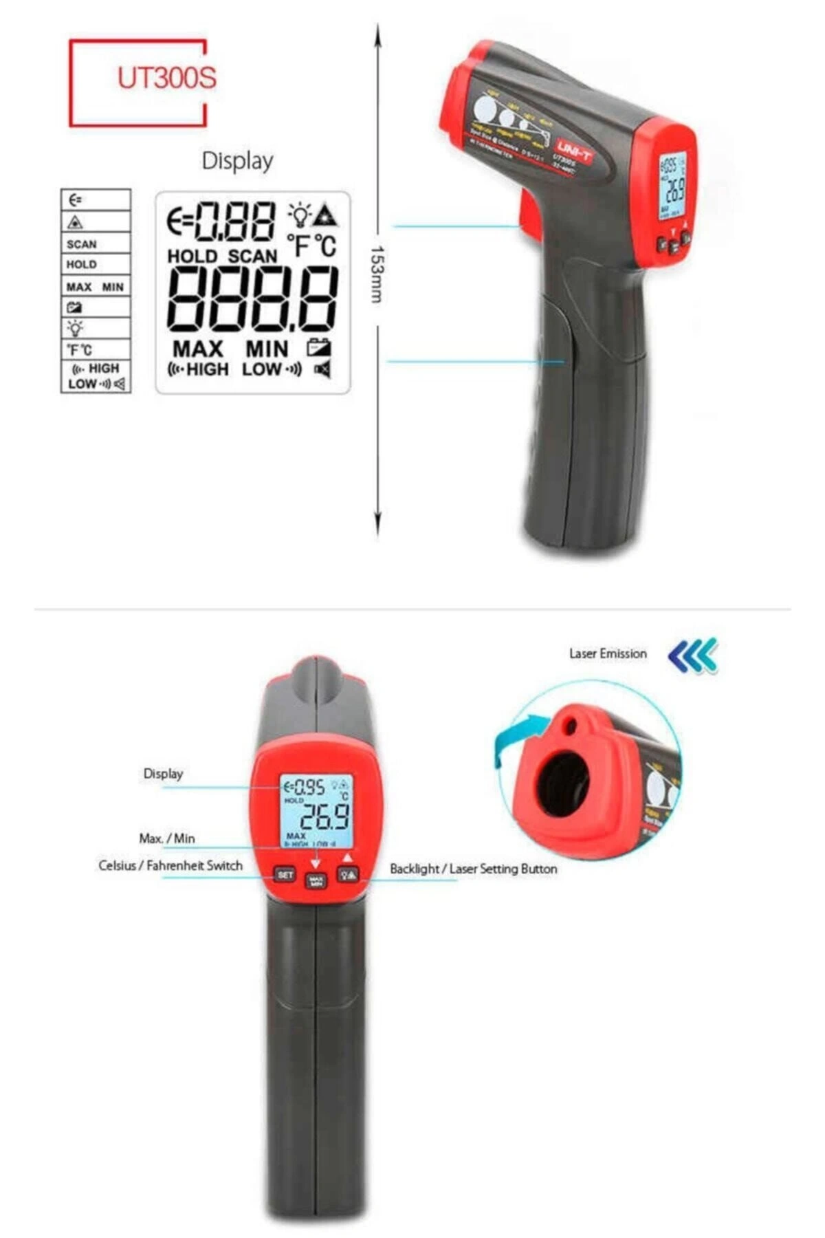 ----------------------------------------------------------------------------- İNSAN ATEŞİNİ ÖLÇMEZ - NESNELERİN SICAKLIĞINI ÖLÇER LÜTFEN ALIM YAPARKEN DİKKAT EDİNİZ ----------------------------------------------------------------------------- UNI-T UT300S Kızılötesi Temassız Termometre Sıcaklık Ölçer Özellikler: 1. ; Çift ekran (gerçek zamanlı / MAX, gerçek zamanlı / MIN) 2. ; °C / °F seçenekleri ( Santigrat / Fahrenheit ) 3. ; LCD arka aydınlatması 4. ; Otomatik kapanma 5. ; Zayıf pil göstergesi 6. ; Otomatik veri tutma 7. ; İsteğe bağlı (açık / kapalı) lazer pointer 8. ; Sesli alarm ile ayarlanabilir yüksek / düşük sıcaklık sınırı Ölçüm Tipi : Infrared Tipi Maksimum Sıcaklık Değeri : 400 °C Minimum Sıcaklık Değeri : -32 °C Marka Unit Kullanım Türü El Tipi Ölçüm Mesafesi 100;