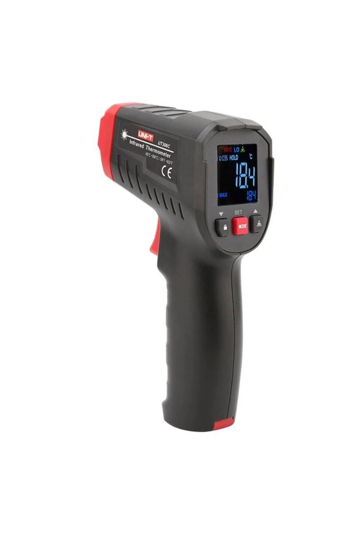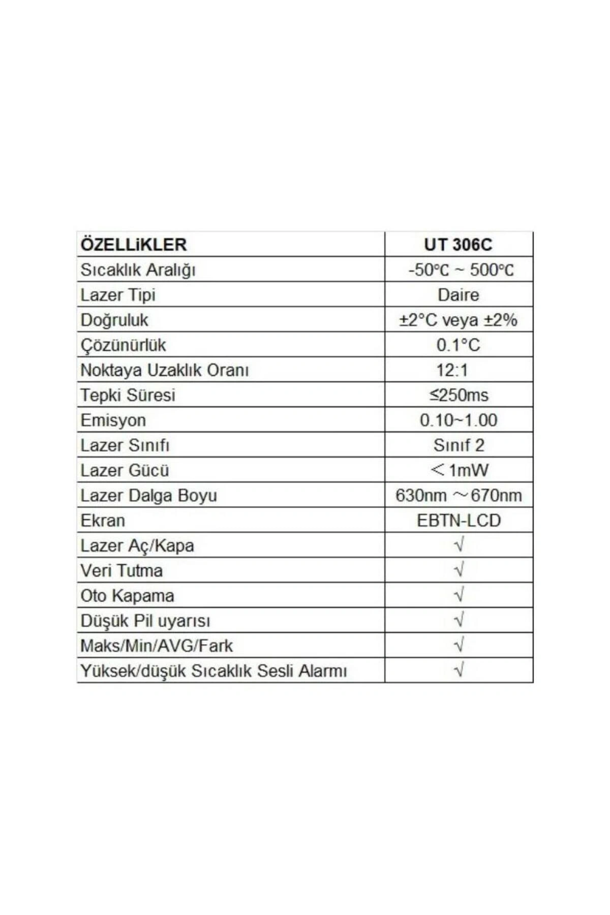 Unit UT-306C Kızılötesi Lazer Dijital Termometre Ürün Özellikleri sertifikalar : CE/UKCA Sıcaklık aralığı : -50? ~ 500? lazer tipi : Daire Kesinlik : ±2°C veya ±2% Çözünürlük : 0.1°C Noktaya uzaklık oranı : 12:1 ?/? seçenekleri EBTN ekranı Otomatik kapanma Düşük pil göstergesi MAX/MIN/AVG/DIF mod UT306 serisi sağlamdır ve kullanımı kolaydır.; Kullanıcılar nesneye dokunmadan yüzey sıcaklığını ölçebilir.; Bu ürün serisi, gıda endüstrisi, makine bakımı, metal işleme, soğuk hava deposu ve diğer endüstriyel alanlar gibi çeşitli alanlarda kullanılabilir.; Not : Parlak zeminlerde doğru sonuç vermeyebilir.